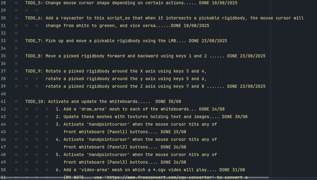 I attach my first video which will serve to give background on the environment of the room and how the player/camera moves around it, as well as how the whiteboards on the walls of the room can display user instructions, graphics and videos.