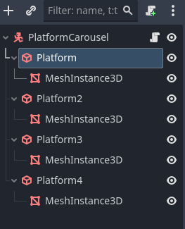 the “platform carousel“ scene has 4 platforms that are added in the editor, but the properties of these platforms can be changed for each carousel. the platform_count property affects how many platforms a specific carousel has and if it’s less than 4, it deletes the ones it has by default until it has the specified number.