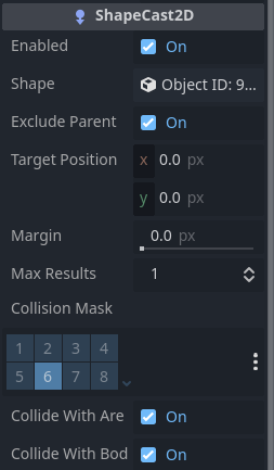 This problem can be mitigated by resizing the Area2D’s CollisionShape2D to be smaller (as demonstrated in the below screenshot), but ideally, the ShapeCast2D should only report a collision if it’s actually colliding with the Area2D.