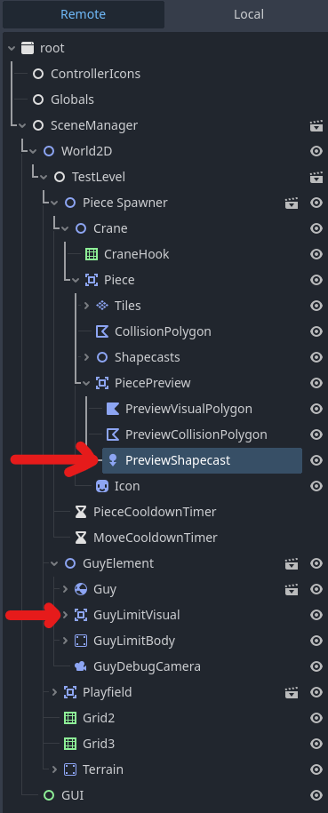 Here is my scene tree, as seen via the “Remote” tab. As far as I know, the nodes most relevant to my problem are the Area2D titled “GuyLimitVisual” and the ShapeCast2D titled “PreviewShapecast”.