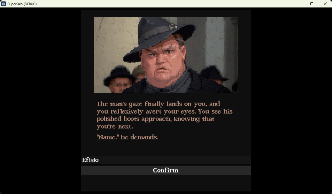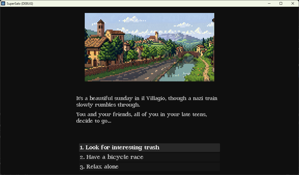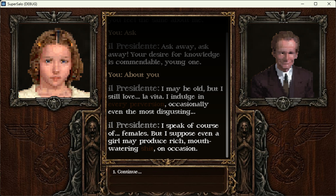 The game is a text adventure in a 90’s PC style, despite the “Super”. It’s based on the film Salò, or the 120 Days of Sodom (1975), a highly controversial film that touches on a lot of pretty horrific themes.