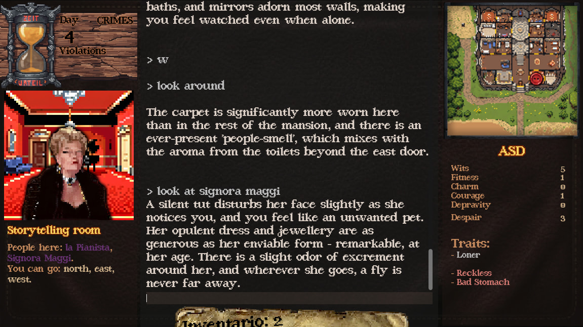 The game is a text adventure in an early 90’s PC style, despite the “Super”. It’s based on the film Salò, or the 120 Days of Sodom (1975), a highly controversial film that touches on a lot of pretty horrific themes.