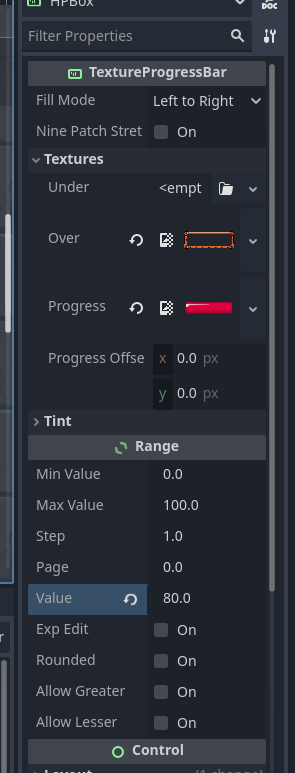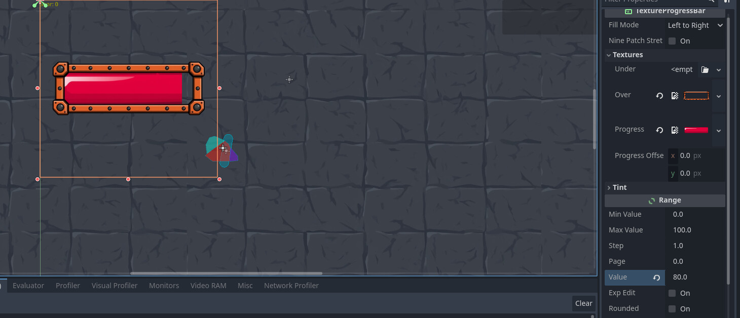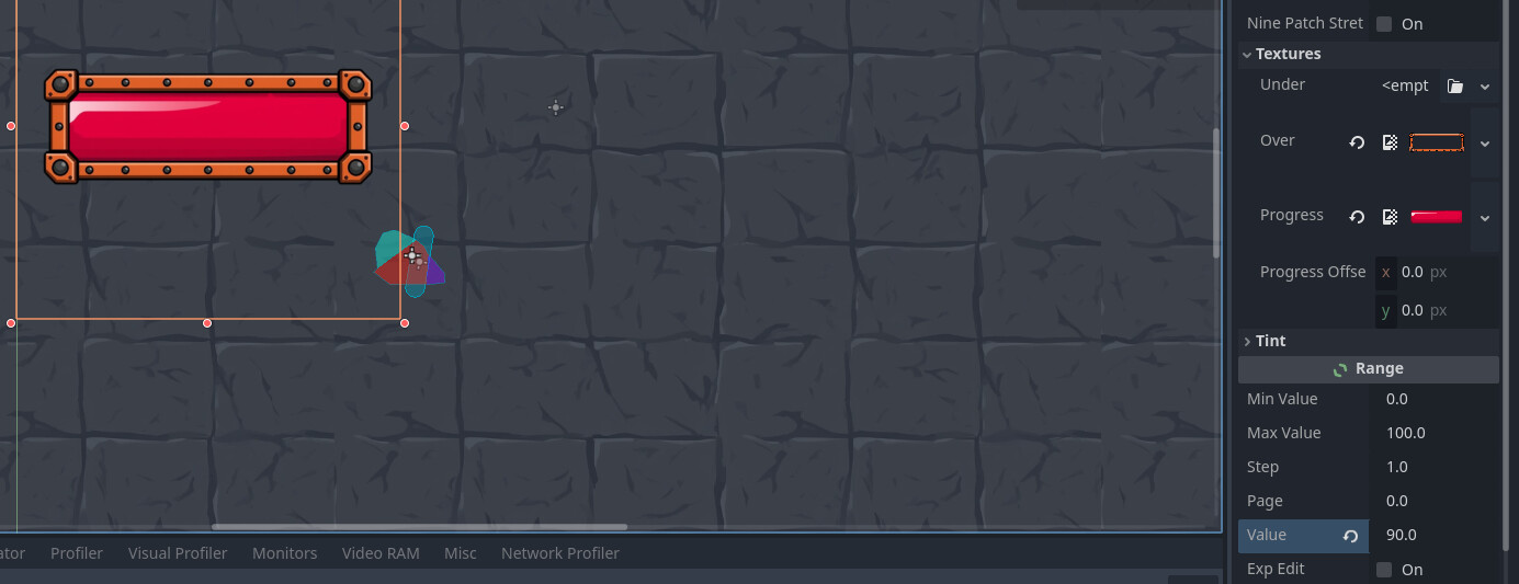 Hello All, I’m trying to make health bar for my game. I added texture progress bar and added 2 pngs. When I set value 100 it shows full but when i changed to 90 it doesn’t change. It changes when it’s 88 to 0. 100 and 90 shows the same amount. I’ve changed the progress ofset to see if it’s because of the outside frame but it isn’t.