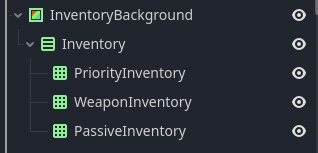 Problem is, the inventory items don’t seem to be grabbing focus no matter what I do. Their focus mode is set to “all”, and it’s not as simple as defining their neighbours, because everytime the player gets or loses an item, the inventory is updated, and all the TextureRect children of PriorityInventory, WeaponInventory and PassiveInventory are deleted and re-created.