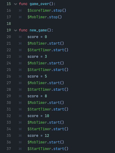 Your new_game function will immediately set the score to be 12 and simply start both the MobTimer and the StartTimer once, and that’s it.