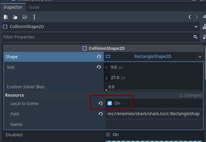 yes, but that doesnt work either. Also, when you refer to the collision shape, you mean inside of the scene? because when I put my enemy on this scene, it is a scene, so its encapsulated(i know I can make it editable children or “make local”, but I think it’s not the right way to do it). I noticed when I make the resource local to scene, also fails:
