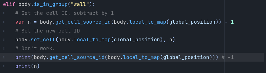 I trying to make the wall change if attacked, but when i try to set the ID of the cell it becomes -1 and the cell disappears. I’m a beginner, English isn’t my first language, and Idk where I shoud start to solve this. Help.