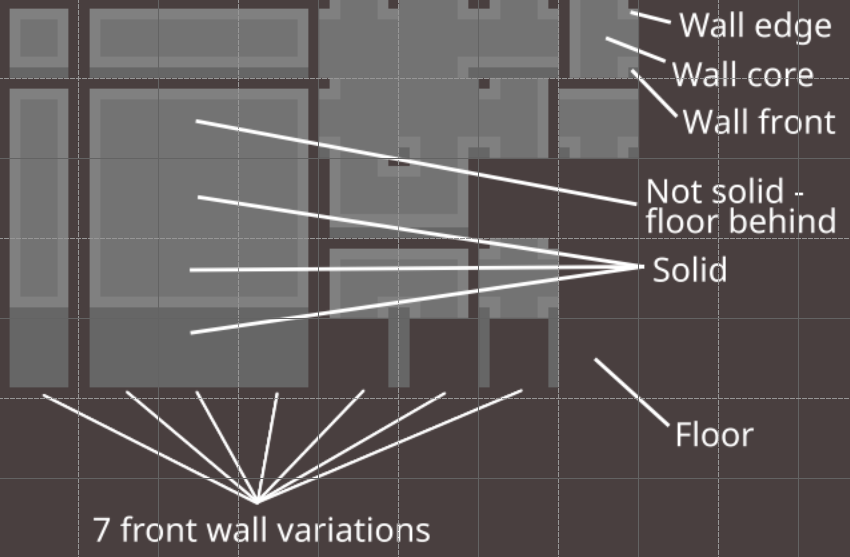 I want to make a terrain using the tileset format above, but I have no idea if this is even possible or where to start really. Each tile consists of a top component (32x32) and a front wall component (32x32). There are a lot of top variations but only 7 possible front wall configurations. I also need to place the top tile above where the actual solid part is, so it overlaps the floor behind - I will mask the wall somehow if the player walks behind it. Characters and items etc will have their origin set to the bottom so they draw half way up the tile and their top will show behind the wall.