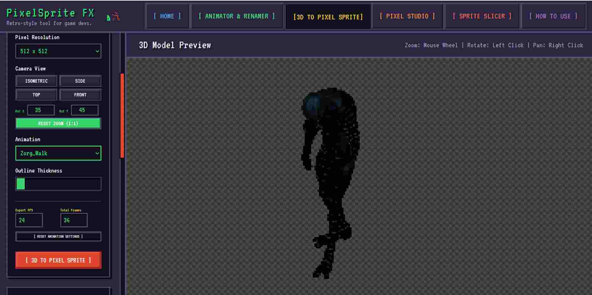 This website provides the tools you need to create pixel animations, sprite sheets, and game assets directly in your browser. Extracting frames from GIF files, slicing sprite sheets, editing pixel art, and converting 3D models into pixel sprites for 2D games is faster and easier. Preview your model prototype more quickly.