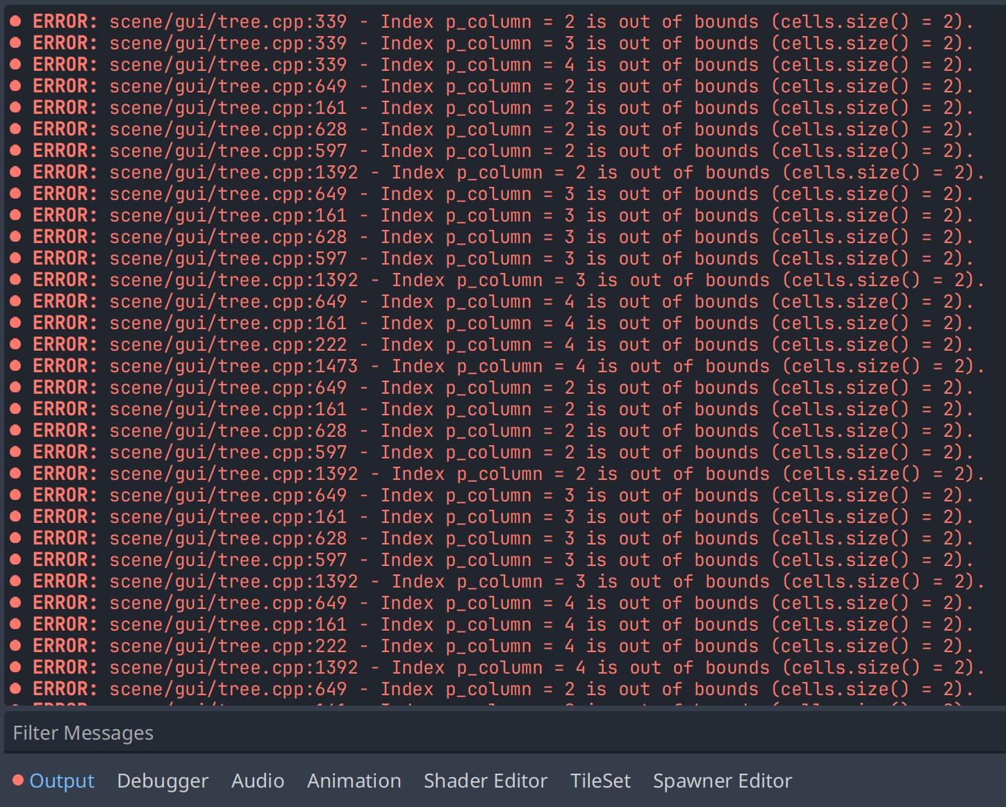 I am building a custom plugin for my game, in which I am rendering a nested resource structure in a Tree node. All the functionality and rendering is working fine, but every time the plugin is rendered (on selection of a specific type of node) the console is spammed with these “out of bounds” errors: