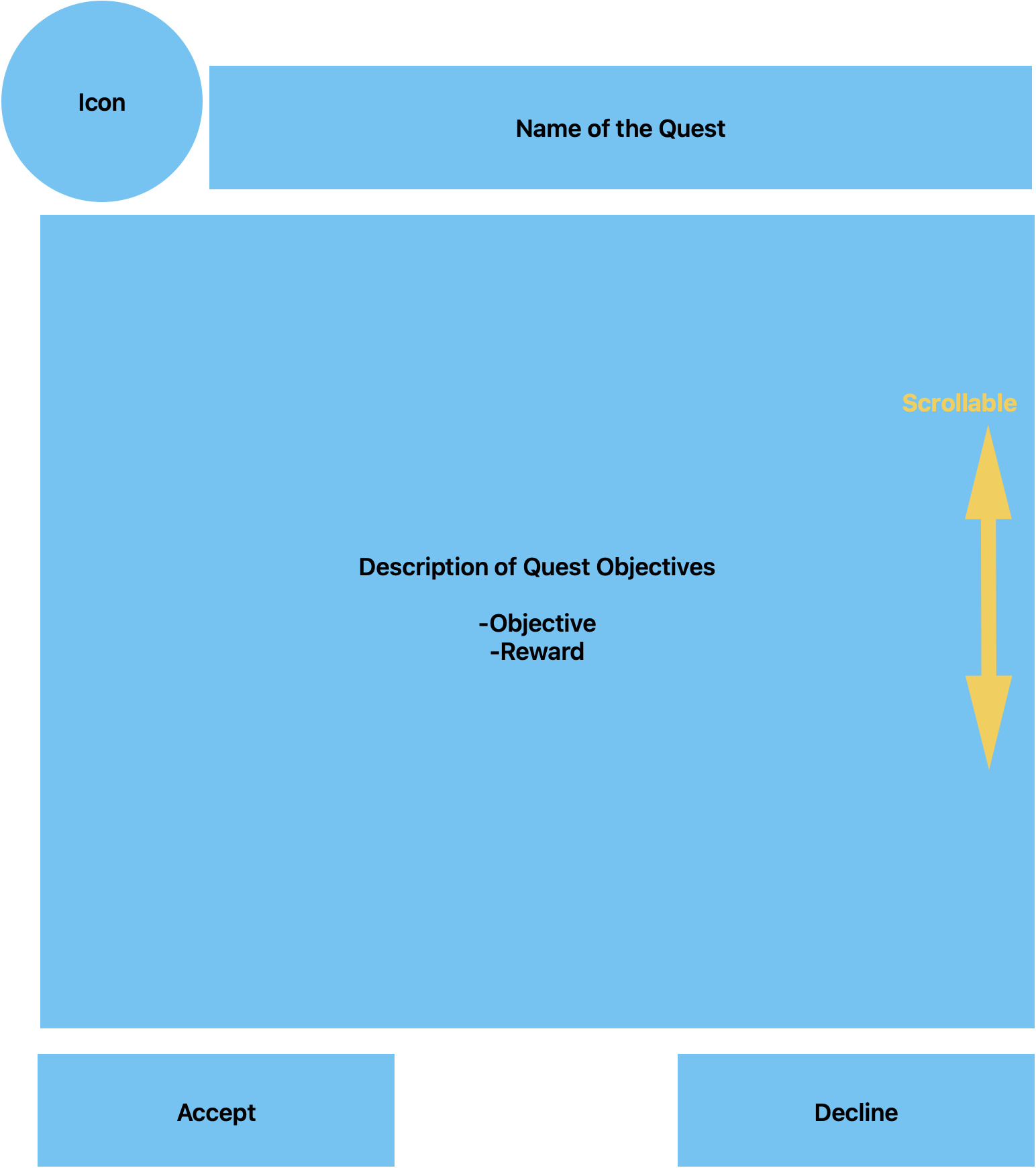 The secret here would probably be to use lots of H and V box containers to align everything as you need it. Nest it all in an HBoxContainer to get that Icon/NameOfQuest > Description > Accept/Decline alignment. Then the Icon/NameOfQuest would be it’s own VBoxContainer to keep them side by side. Description would probably be a mix of ScrollableContainer and another HBoxContainer. I don’t know what sort of layout you’re looking for in there, though. And then Accept/Decline would be another VBoxContainer.