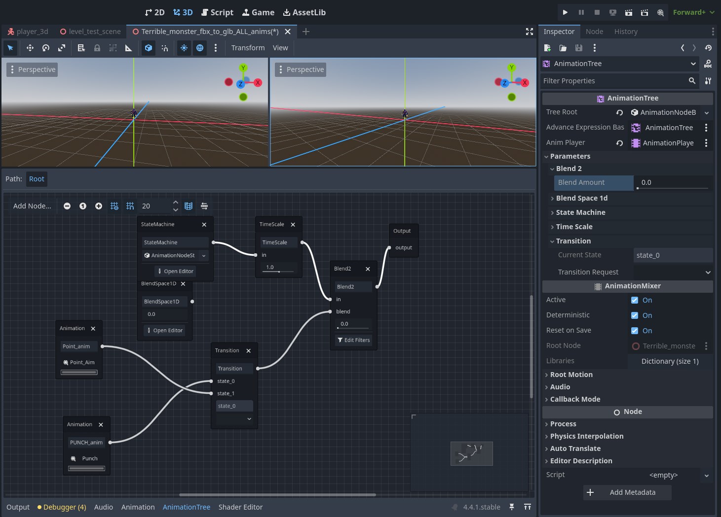 I’m a beginner to Godot and I started setting up a 3D character. I’m using the AnimationTree feature, so far I’ve got a character walking, jumping and punching with controller & mouse input. I’m using ‘Enable filtering’ to separate legs from upper body animation – the punches are controlled in the transition and the walking is in the statemachine.