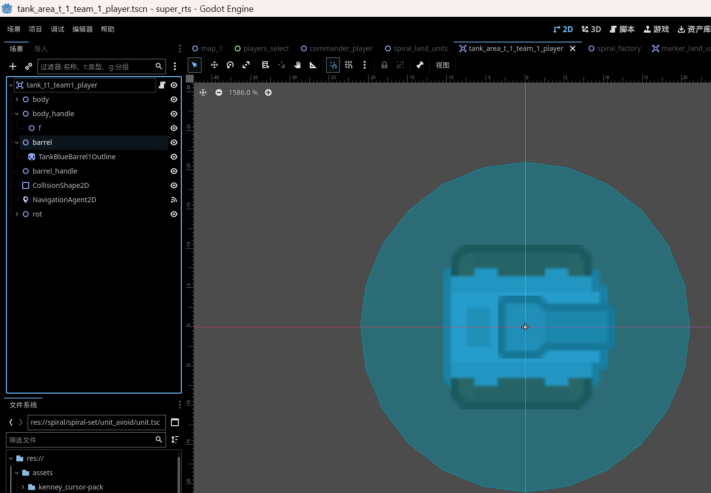 As you can see, tanks are area nodes that move by colliding with each other; The static body2d of the tree is used to bake the navmesh and will not physically collide with the tank, but it has a static NavigationObstackle2D obstruction.