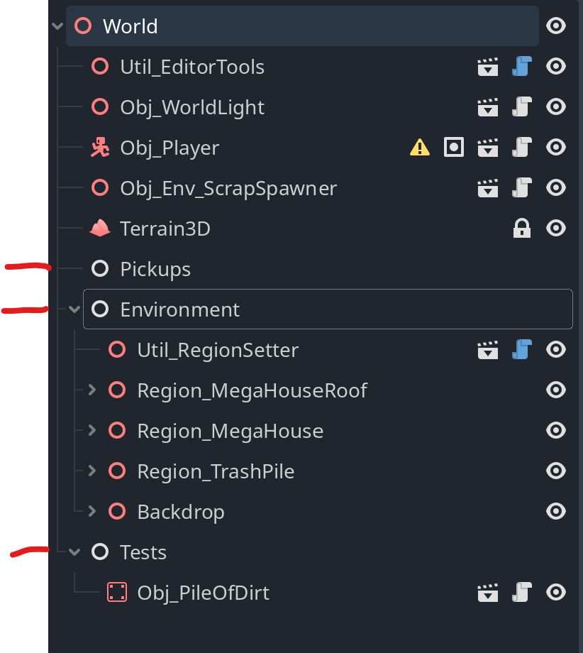 Using the base Node type could be bad, it breaks the transform between your Node3Ds. If you move the “World” node then your player, world light, editor tools, scrap spawn, and terrain will move, but the other objects will not, because they are children of a Node.