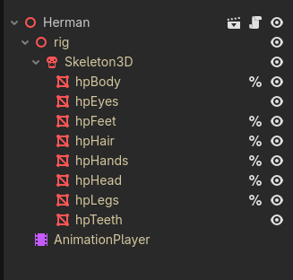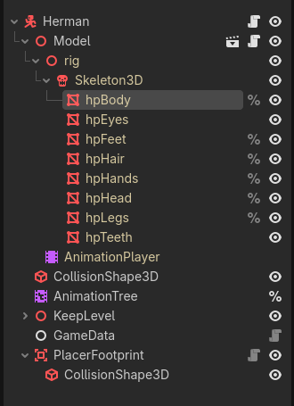 My CharacterBody3D scene uses this inherited scene and adds collision shapes, an animation tree pointed at the animation player coming from Blender and some other game-specific stuff like a billboard with the character name. The attached script at this level is mostly controlling the animation tree.