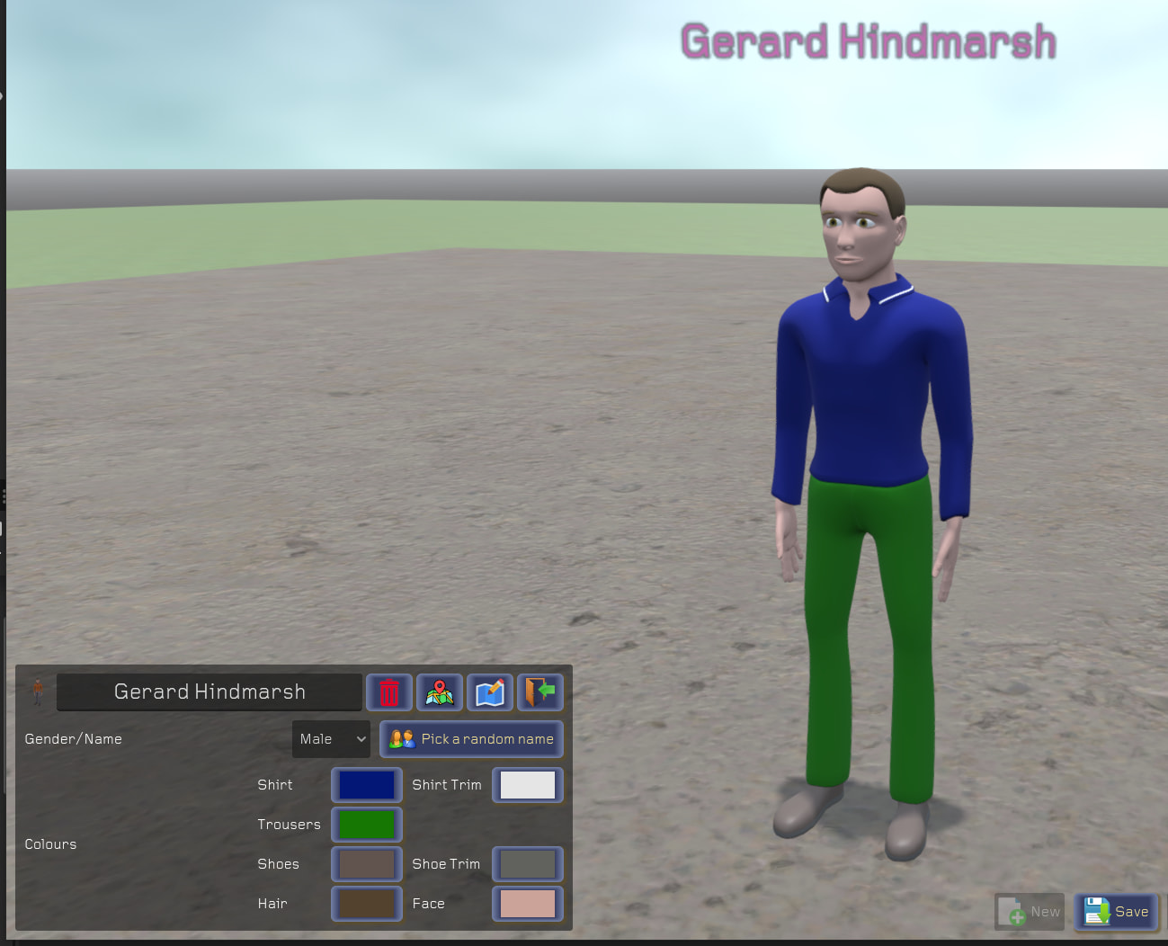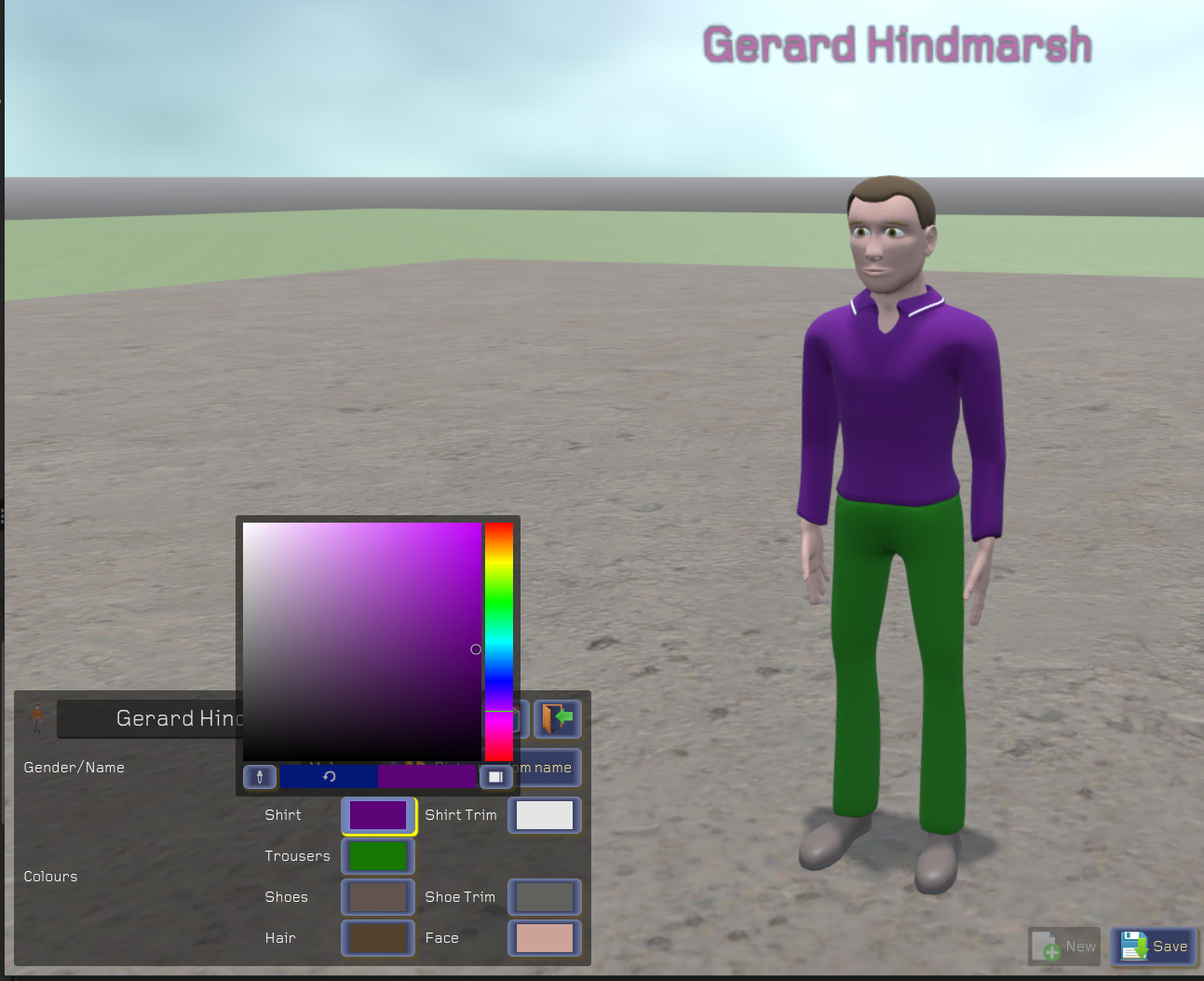 Which finally brings us to the, for me, newly discovered ColorPickerButton. During game play I want the player to be able to modify colours of individual instances of the human character. Clicking on a character instance brings up a panel that include a set of ColorPickerButtons with the current colours being fetched from the clicked character. Choosing a new colour value sends that colour back through the inherited scene script to put into the relevant override slot.