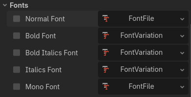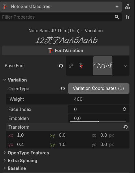 The problem currently is that I’m using the font “NotoSansJP”, but when using the BBCodes with the RichTextLabel, like this “[i]italics text here[/i]”, I’m not getting the italicized version of the text.