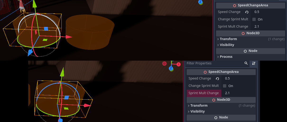 I made a simple Area3D that does just that, it sets the player’s speed or sprint speed multiplier if change_sprint_mult is enabled to something else while the player’s in the Area and resets it when they’re outside.