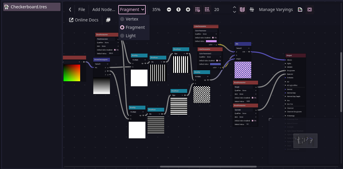I went back today to do some more work and upon loading the project discovered that the shader graph is completely empty except for the default “output” node. Interesting, however, is that the shader I made still exists in the resource list, it’s still used as the material on the sprite, and it still functions in the test scene. Even more interesting is that when I click the button to view the generated code, it generates the code completely, as if the nodes were still there, however the graph is completely empty as I said, other than the default “output” node.