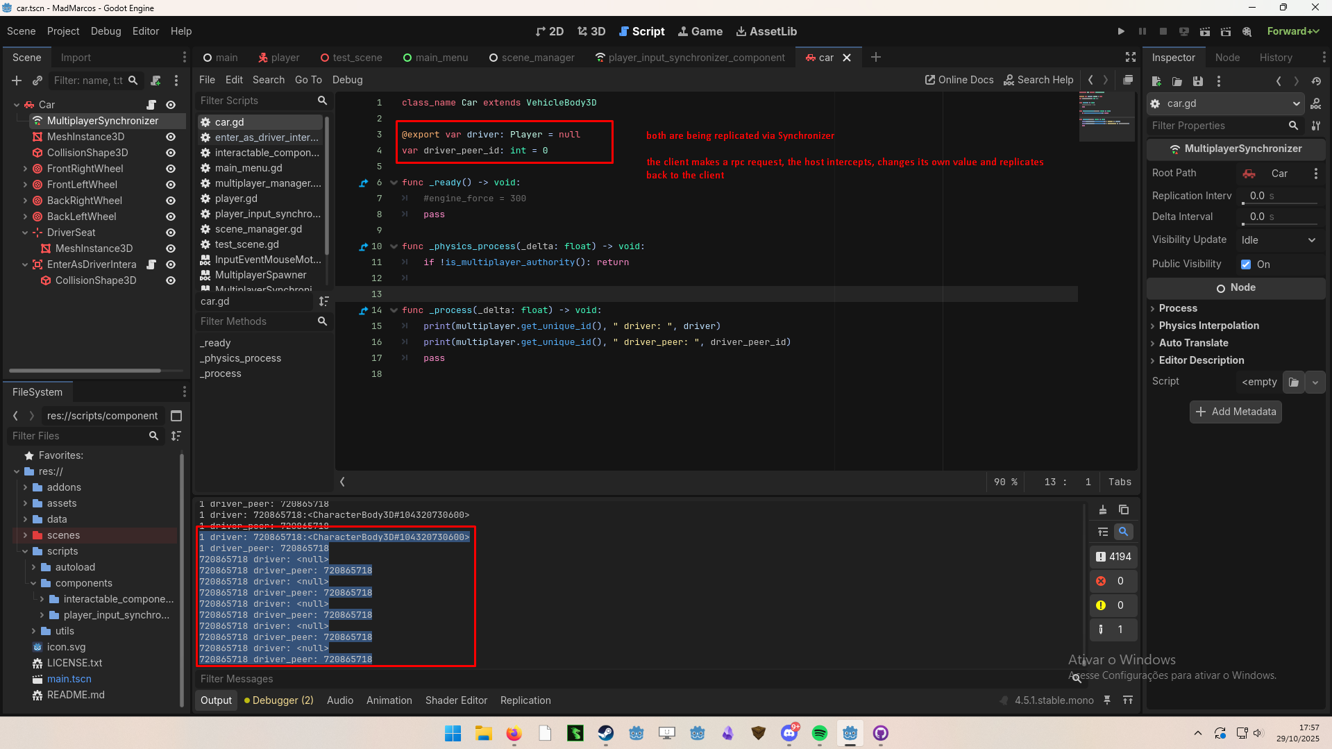 Then I got a problem with replicating which player was trying to become the current driver of a car, the variable holding the player value wasnt replicating, after trying a little more I discovered reading the docs that Objects/Resources cant be replicated, neither their ids, just native Variant types or something like that
