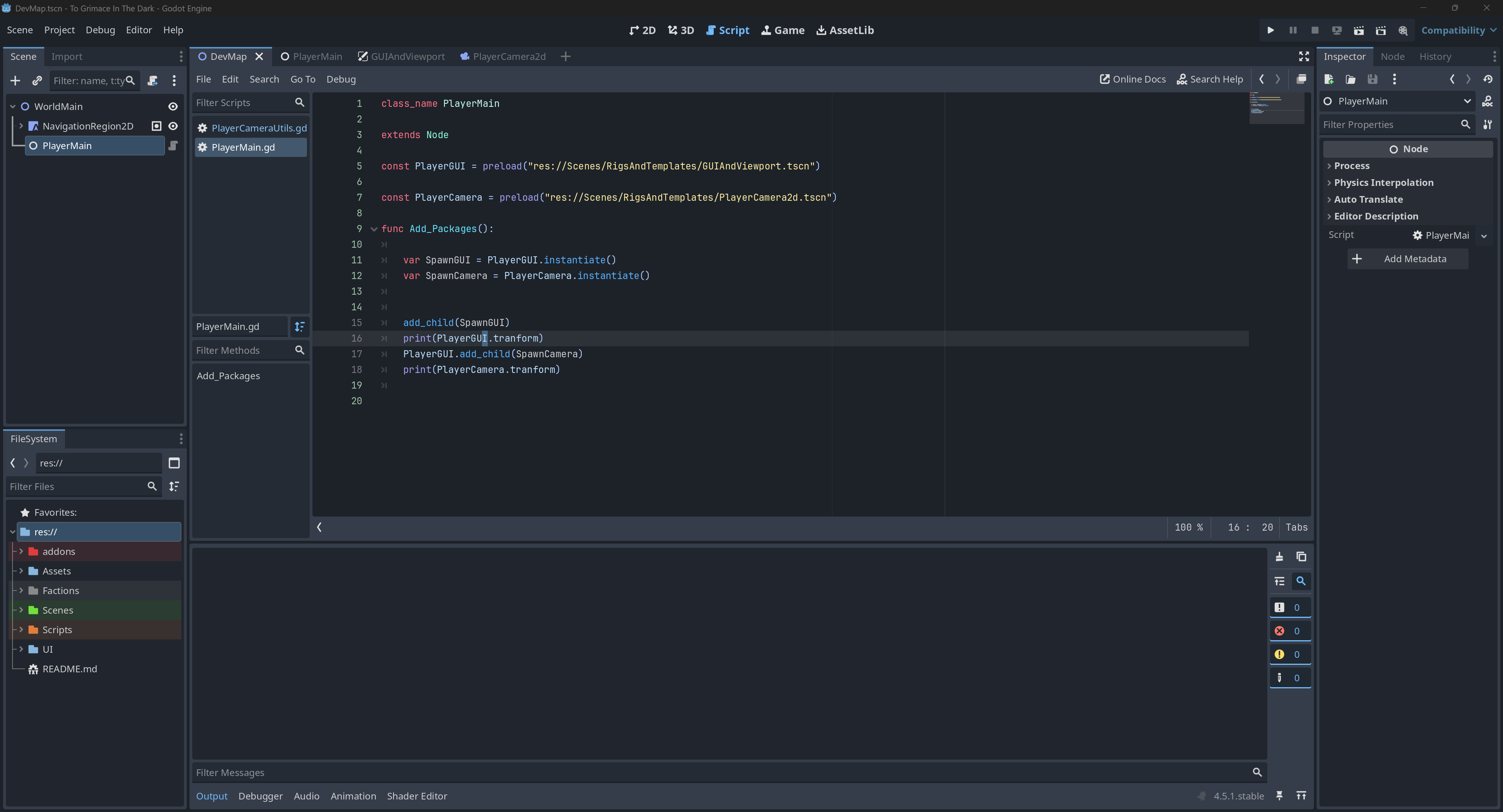I am attempting to preload each element of the scene and then instantiate it in the node at the start of everything so the camera in my test scene is there when I finish loading and I can see and move but that seems to fail to do anything at all. . . And I don’t know what could be causing it as there seems to be no errors.