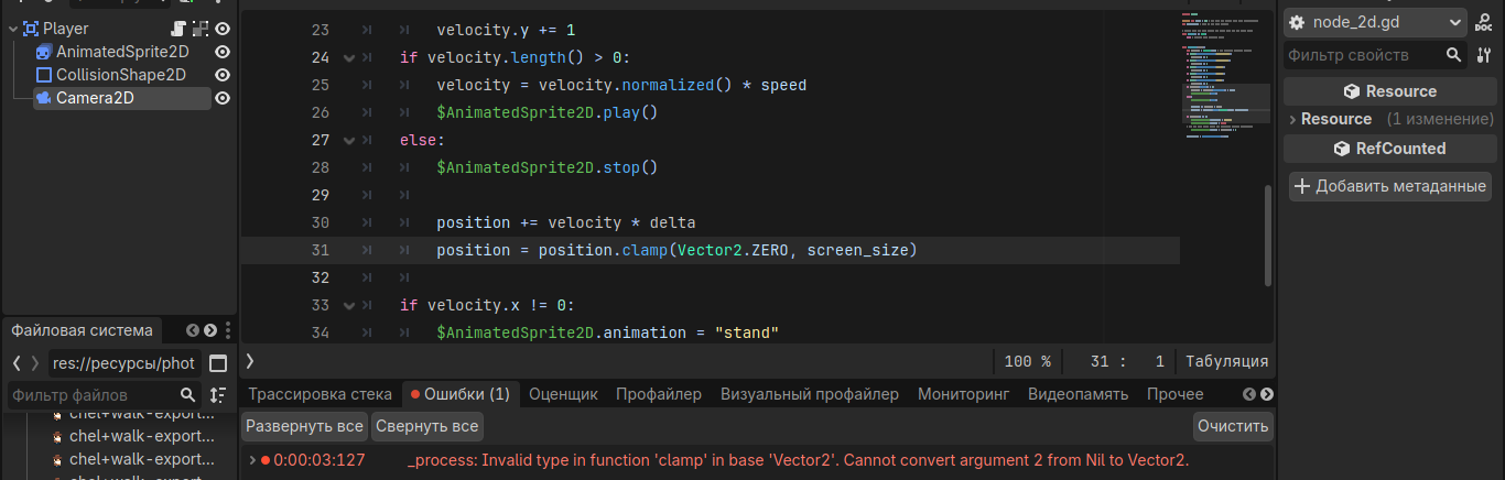 The error message is telling you that it cannot use ‘screen_size’ in that ‘clamp’ operation, as it’s either the wrong type, or simply ‘null’. It would appear from your postings that you are trying to run before you can walk. No problem with that, except that it’s the slowest way to progress. A far faster method would be to learn the very basics of programming, and Godot, from tutorials and/or videos. The usage of ‘print’ statements for following code results would be a part of that learning, and is a very basic skill to have. It’s not difficult at all, but it needs humility and patience to do what all programmers do : start from the modest beginnings and advance slowly but surely. Hope this helps; peace.