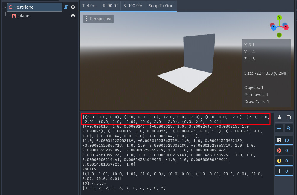The script is attached to my TestPlane node to expose a button in the editor than retrieves information about the plane Mesh: