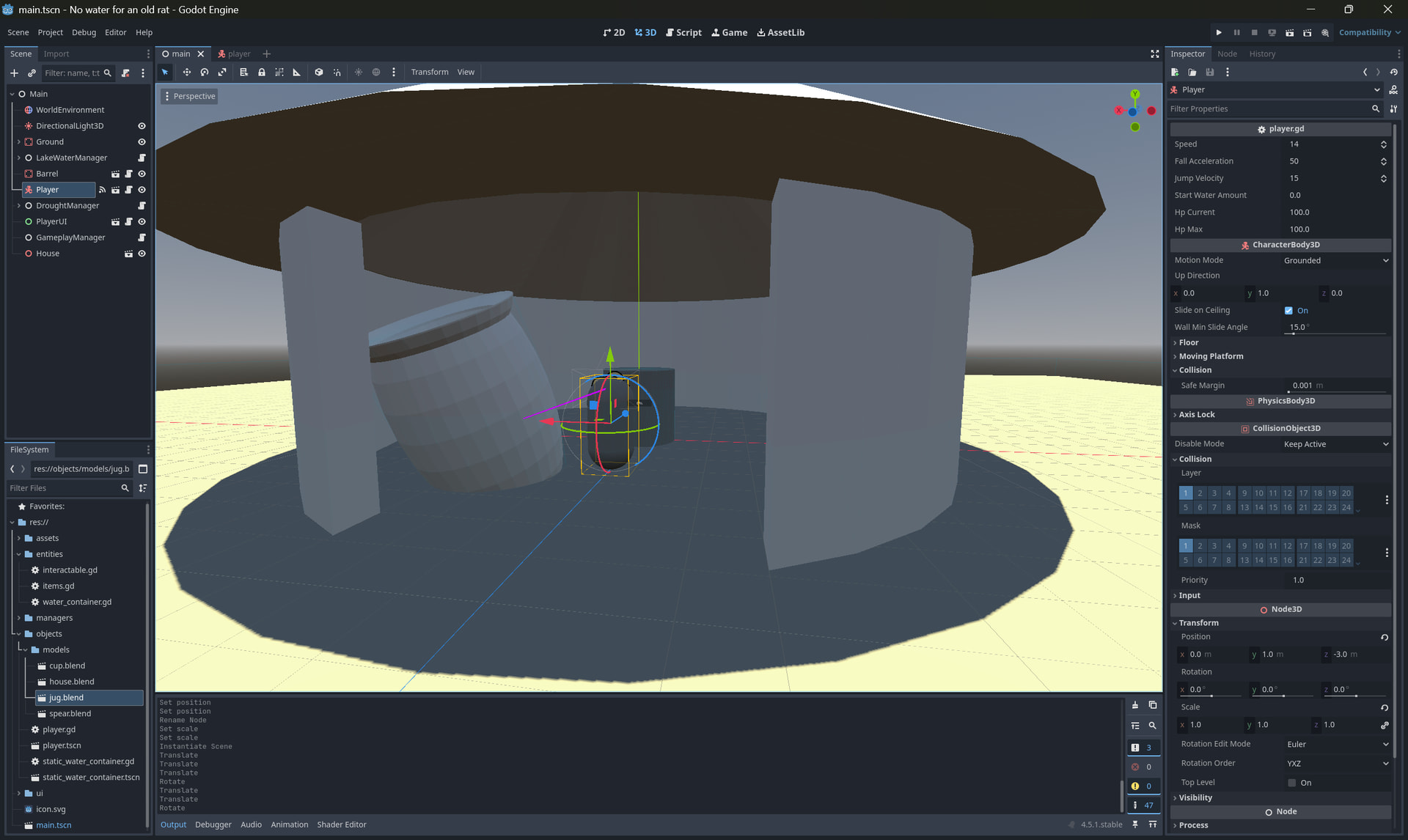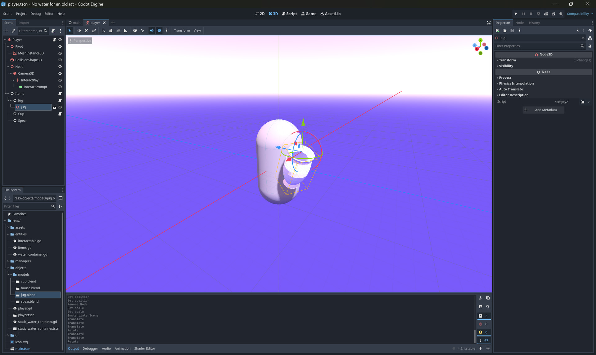 I created a “jug” model in blender, saved project file (.blend), imported it into the “player” scene, positioned it the way i want.