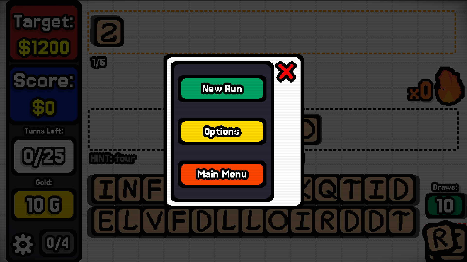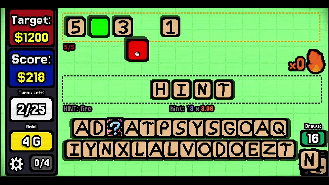 Just went for another run, spelled “right” then “right east”. No scoring. These systems are a bit unintuitive. Balatro’s success, IMO, is largely due to how smooth it plays. The metagame is also quite complex with synergies. This game has the opposite. Playing just one turn is a struggle, and the metagame is rather simple.